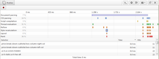 Opera will then give you a break down of where time was spent rendering. If you click individual style calculation (the orange blocks or the style recalculation section you will receive a detailed breakdown).