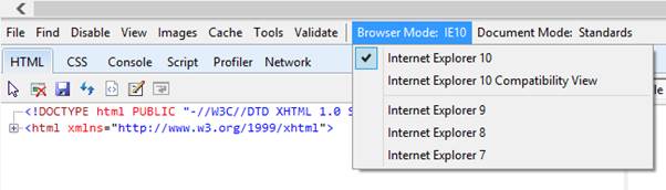 For example if you want to test a page with a doctype in IE7 standards mode you can set the browser mode to IE7 (the IE7 user agent string will now be sent) and ensure the document mode is set to standards mode.