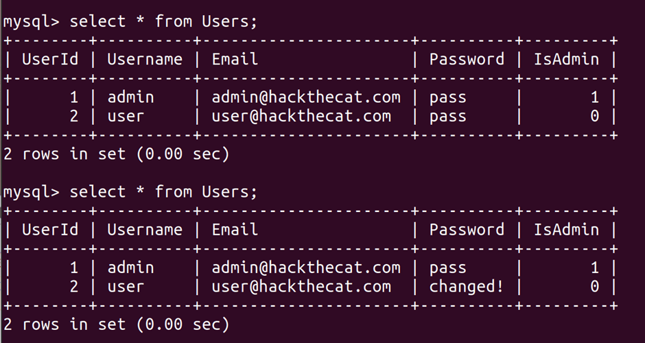 When this runs you’ll then find this has changed the users password – here’s an exciting before and after mysql query screenshot – note how the password is “changed!” in the second query: