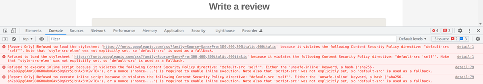 Changing this to “Content-Security-Policy” mode will also display information about the referenced stylesheet hosted on fonts.googleapis.com being blocked as we haven’t said this is OK in our policy: